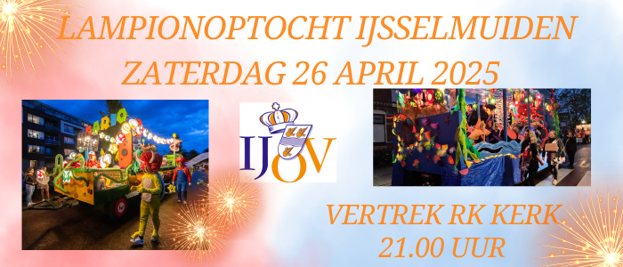 De IJOV organiseert op zaterdag 26 april om 21.00 uur weer de jaarlijkse lampionoptocht in IJsselmuiden. Het is een spectaculair evenement met schitterende versierde wagens, kinderen met blije gezichtjes in de allermooiste kleding, verlichte lampionnen en prachtige muziek van verschillende korpsen. Om deze stoet tot een succes te maken, hebben we jouw hulp nodig!